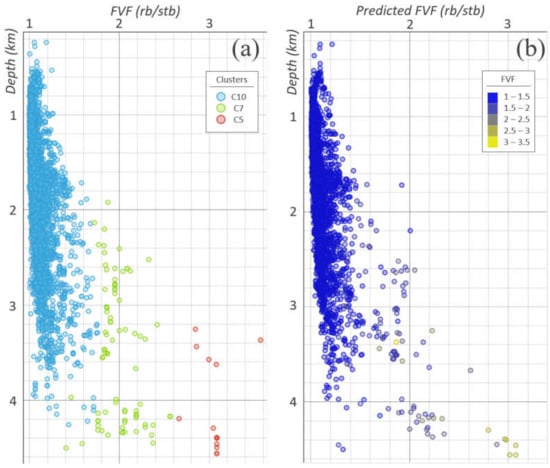 Results from random forest learning. (a) Recorded FVF values plotted against depth. Hierarchical clustering was used to remove outliers. Three clusters (C10, C7 and C5) were used for model training. (b) FVF predictions (based on API, depth, temperature and viscosity data) plotted against depth. Data points are coloured based on their actual recorded FVF value. Some regions of incorrectly predicated values are identified, particularly at greater depths. Cross-plots modified from Orange Data Mining software [].