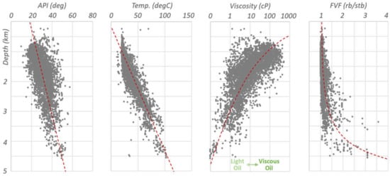 The approximate relationship between depth, temperature, API, viscosity and pressure and how these relate to the reservoir fluids. Adapted from [].