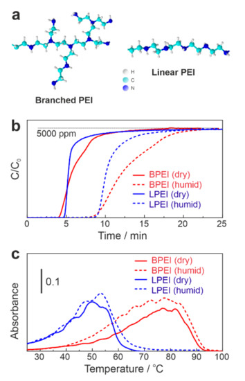 (a) BPEI and LPEI molecular structures; (b) CO2 capture (5000 ppm CO2 in He balance with/without H2O vapor, 200 mL/min) at 25 °C; (c) TPD profile (5 °C/min, 200 mL/min of pure He).