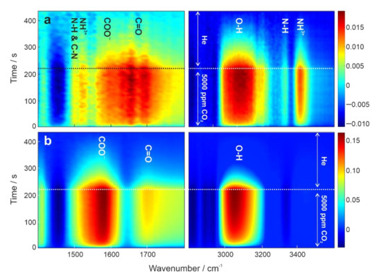 To understand adsorption–desorption mechanisms at the molecular level, we applied in situ diffuse reflectance Fourier transform infrared spectroscopy (DRIFTS) combined with modulation excitation spectroscopy (MES) [33,34,35]. In situ MES-DRIFTS enhances the signal-to-noise (S/N) ratio, and thus allows in situ monitoring of a trace amount of active species involved in chemical reactions [33]. Figure 3a,b display time-domain IR spectra of BPEI and LPEI during repeated adsorption-desorption cycles at 50 °C. The spectral characteristics between BPEI and LPEI differed considerably; the absorbance for LPEI was higher by a factor of 10. This enhanced adsorption–desorption during modulation experiment accounted for the lowered desorption temperature, releasing all the CO2 at 50 °C within 200 s in the He flow. The IR bands observed for BPEI were well comparable to the ones previously reported [6]: ν(N-H) of carbamate and ammonium ion centered at around 3400 cm−1, ν(C = O) of carbamic acid at 1680 cm−1, ν(COO−) of carbamate at 1558 cm−1, δ(NH3+) of ammonium ion at 1530 cm−1, and overlapped δ(N-H) and ν(C-N) of carbamate at 1502 cm−1. As shown in Figure 3b, LPEI showed a completely different spectral feature. There were no IR bands assignable to carbamate or carbamic acid detected. Interestingly, ν(N-H) at around 3400 cm−1 completely disappeared. The band at 1405 cm−1 can also be assigned to ν(C-N). CO2 adsorption with primary and secondary amines is considered to occur as follows [5]: