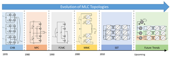 Figure 2 illustrates the evolution and emergence of new MLC topologies. The MLC concept emerged in the 1970s, invented and patented by William MacMurray, with the cascaded full-bridge configuration. The same inventor pioneered another approach, where the full-bridges were in parallel, sharing the same DC bus, with low-frequency cascaded transformers at the output of each submodule of the full-bridge [67,68]. The cascaded full-bridge topology has been matured, widely used by ABB (Oerlikon, Switzerland), featuring a modular and robust structure that is fault tolerant with the addition of bypass switches. The main disadvantages reside in the need for each submodule to require a DC-source. The cascaded transformer approach mitigates this problem, obtaining a single DC-source on the lower voltage DC-side. Although it allows a simpler DC bus balancing control algorithm, it requires special care in the sizing and control of the AC side in order to avoid the saturation of the transformers. In order to avoid an average value of the magnetic flux variation, it is recommended that the system start at 90° or to 270°, taking into account an application of AC. Thus, the flux density integral from the instant of 90° to 270° has a similar symmetrical value to the integral from 270° to 90°, obtaining a null value at each period [69]. Otherwise, the flux density would have an average value, which could saturate the ferromagnetic core. This is especially important for ferromagnetic cores that are not laminated and have low flux density values.