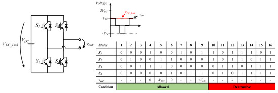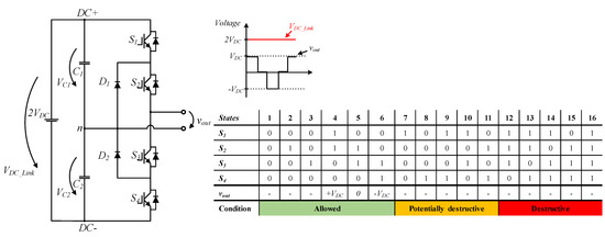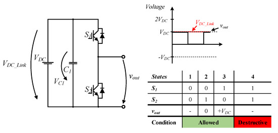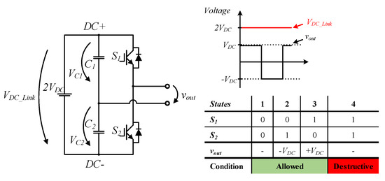 Regarding the split DC bus half-bridge topology, it has a simple structure, as shown in Figure 3. This topology features two capacitors on the DC bus and two IGBT devices connected in series. The midpoint of the capacitors is used as the reference potential for the output voltage, vout, of the converter [73]. As a consequence, to be able to generate an output voltage with a value of VDC_Link, the DC bus will need to have twice the voltage. Thus, each capacitor that makes up the DC bus will have a voltage equal to VDC_Link. Figure 3 shows the allowed states of operation of the topology.