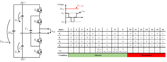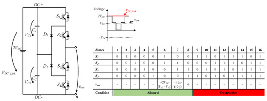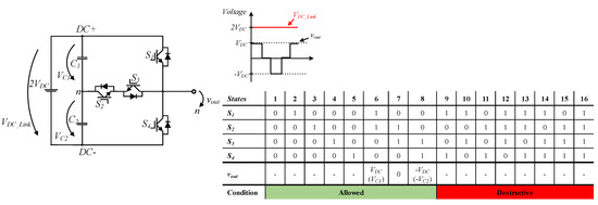 This topology is expandable, requiring the addition of more semiconductors and capacitors. In [74,100], it is possible to find other variations of this topology, namely in its expandability to more levels. Control algorithms and applications are also presented. However, the more levels, the more diverse the current paths of the converter, with short and long paths to charge the DC bus. Due to this difference in impedances, even with similar semiconductors, this topology has as a major disadvantage the imbalance of the DC bus voltages. Nevertheless, the modulation technique adopted can intensify voltage imbalances. In order to mitigate this problem, different solutions have been explored: active control, active auxiliary circuits, and passive auxiliary circuits. A solution based on active control presents a greater complexity of implementation, requiring a microcontroller with greater processing capacity. In turn, active auxiliary circuits require additional hardware, essentially increasing complexity and cost. Finally, passive auxiliary circuits are characterized by increased system losses, decreasing the efficiency of the converter. This topology only has redundant states of operation between phases (phase–phase) of the power grid and not in the same phase power line. As such, if redundancy is an imposed feature, this NPC is only viable in three-phase applications, where, for example, a six-level NPC can obtain 216 redundant states [101]. The lower the modulation index, the higher the redundant states are [4]. Another variant of the NPC topology used as a submodule can be found in the Figure 7.