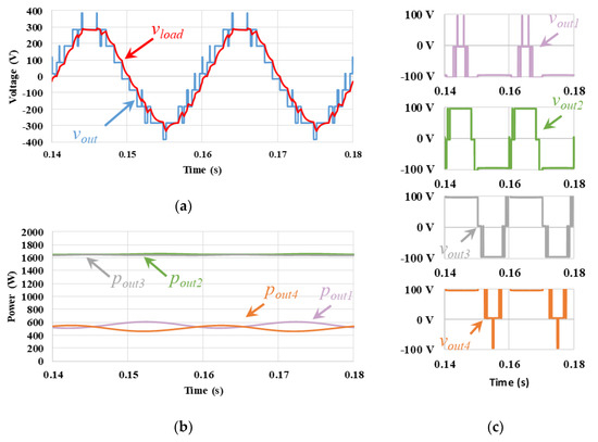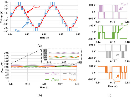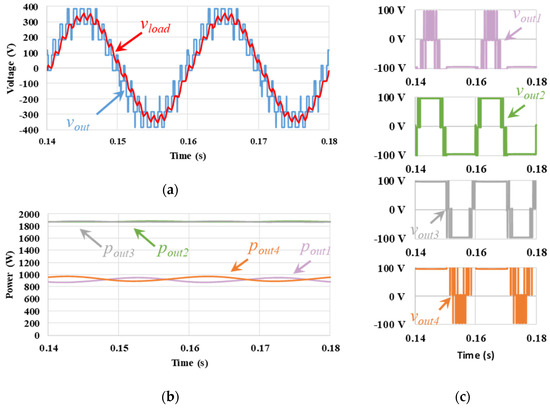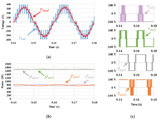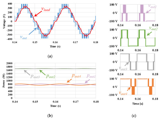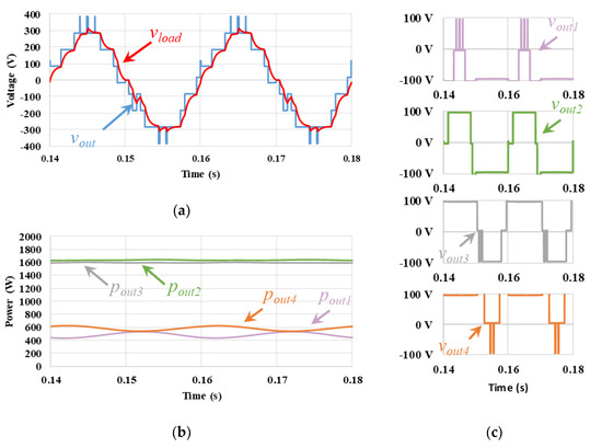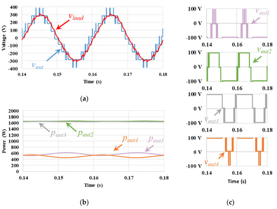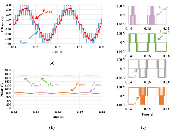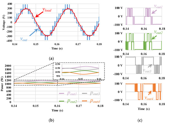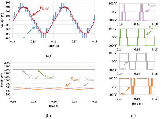Another approach consists of connecting different full-bridges in parallel, adding an isolating transformer at the output of each full-bridge. Each submodule shares the same DC bus, with multiple IGBT devices referenced to the same potential, and the secondary side of each transformer is connected in series with the transformer of the adjacent submodule [96,97]. Combining the different transformer ratios of each transformer again allows for a greater number of generated voltage levels by foregoing redundant states [98,99]. In [77], the switching pattern obtained considering an MMCC composed by four full-bridge submodules with four transformers with different turns ratios is presented. However, it should be mentioned that this approach causes an imbalance in the operating powers of each submodule. According to [16], the submodule with a lower switching frequency contributes 80% of the total power transferred. The lower the switching frequency of each submodule, the higher the power. Regarding the power transformers, special attention needs to be paid to their sizing, as well as the instant to start the control.