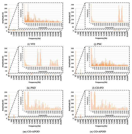 In general, the DC–AC power converters have discrete values in their output, requiring precautions in their implementation in order to safeguard system integrity. That is, considering that the control of IGBTs is based on PWM techniques, the output waveform of the DC–AC power converter will have a resulting frequency equal to or multiple times the switching frequency of each IGBT. Although the output waveform is not sinusoidal, as desired, the frequency of the fundamental component is close to the desired one, as can be seen in Figure 1. This characteristic presents some requirements to be met, depending on the application.