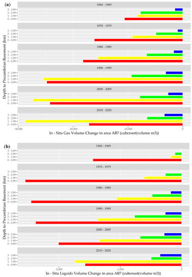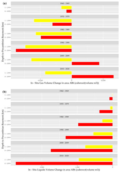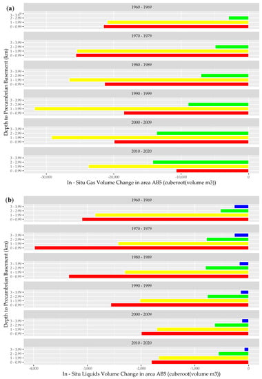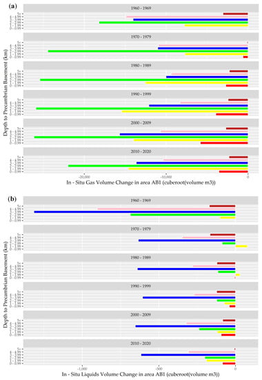 Figure 3a,b show the calculated net in-situ gas and liquid balances across AB1 over the last six decades. This analysis indicates that over this period, the total volumes of liquid and gas extracted exponentially exceeded the respective volumes injected at all depth intervals relative to the Precambrian basement. During the past six decades, extensive gas depletion has been notable in the depth zone approximately 2–4 km from the Precambrian basement across AB1. This result is consistent with extensive regional gas production activity over this period [52]. While a similar trend is noted in the net liquid balance in this area, the level of depletion is lower in the stratigraphic horizons adjacent to the Precambrian basement, and the volume of liquids injected even marginally exceeded the volume of liquids extracted in the deeper stratigraphic horizons during the 1970s and 1980s.