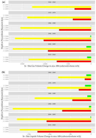 Figure 6. Calculated net in situ (a) gas and (b) liquid balance for AB4 over the period January 1960–December 2020. Red bars: <1 km depth from Precambrian basement; Yellow bars: 1–2 km depth from Precambrian basement; Green bars: 2–3 km depth from Precambrian basement. Source data extracted from geoLOGIC Systems databases © 2020.