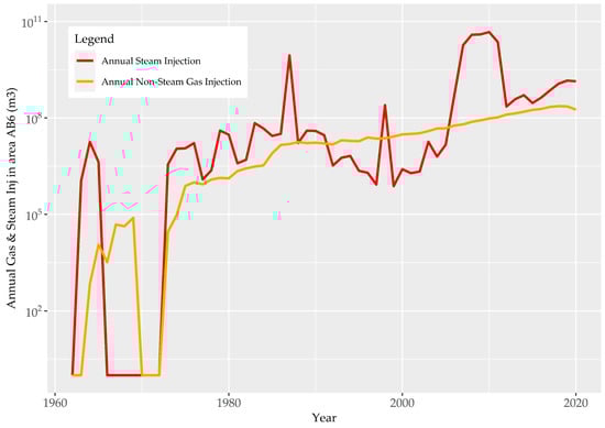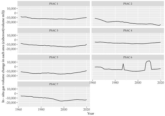 The monthly measured production and injection (stock tank) fluid volume records for each of the approximately 610,000 wells in Alberta for January 1960–December 2020 were extracted from the geoSCOUT® database (about 63 million production records) for each PSAC area, along with the respective total vertical depth (TVD) of each well. The TVD, characteristic API gravity of the corresponding PSAC area and Equations (2)–(3) above were then used to calculate oil and gas FVFs for the stock-tank fluid volume records for each production and injection wells in the Alberta Basin. The calculated FVFs were subsequently used to convert the stock tank oil and gas volume records for each well to in-situ reservoir volumes, following Equation 1. No correction was applied to produced and injected water volumes reported for each well since water (including water containing dissolved gas) is considered essentially incompressible under most reservoir conditions [63]. Steam volumes were also uncorrected since steam is measured and reported in cold-water-equivalent volumes. Steam injected into the subsurface is used for thermal oil recovery and ultimately becomes water in the subsurface. However, in the formation net fluid balance reported below, injected steam is accounted for as a gas since it is in the gas phase at the point of entry into the formation. All data aggregation, processing, and computation was conducted using the R statistical software package (R: A language and environment for statistical computing, https://www.R-project.org/, last accessed on 14 January 2022).