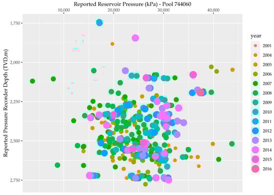 In Alberta, an oil or gas pool is essentially an accumulation of oil or gas that is (structurally) separate from another such accumulation, and approximately 65,000 oil and gas pools exist in the Alberta Basin [65,66]. A common feature of many of the conventional oil and gas pools located in stratigraphic traps is the presence and hydrodynamic support of underlying regional saline aquifers [67,68]. Measurement of the initial (virgin) and subsequent annual in-situ pool pressures is a regulatory requirement for all oil and gas operators; consequently, an extensive public dataset is also available in the geoSCOUT® database. However, while this dataset contains approximately 325,000 in-situ pool pressure-data records, these only cover approximately 7000 distinct oil and gas pools. Pressure variations in such pools indicate pressure variations in the hydraulically connected underlying saline aquifer systems that support the hydrocarbon columns and are consequently representative of subsurface pressure changes across this basin.