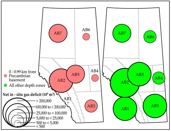 Figure 4a,b show the calculated net in-situ gas and liquid balances across AB2 over the last six decades. This analysis indicates that the total volumes of both liquids and gases extracted also exponentially exceeded the respective volumes injected at all depth intervals relative to the Precambrian basement in this area. In addition, accelerating liquids and gas depletion rates are evident in the stratigraphic zones from approximately 3 km above to the top of the Precambrian basement. This trend is also consistent with the current deep basin tight oil and gas industrial activity in this area [52].