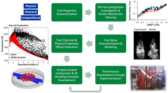 An analysis-led design approach was undertaken to develop customized GCI combustion and air-handling system concepts (Figure 2). First, fuel physical, chemical, and compositional properties were characterized in detail. Based on these properties, fuel autoignition behavior and spray characteristics were evaluated experimentally under engine-relevant conditions of interest. Utilizing these data, high-fidelity chemical kinetic and spray models were developed. Next, the fuel property effects on spray formation and breakup, fuel–air mixing, combustion, and emissions were thoroughly investigated under targeted combustion modes to understand the attributes that were key to the engine and fuel co-development. Subsequently, a comprehensive analysis-led design process that combined 3D CFD in-cylinder combustion simulations and 1D system-level analysis was employed to generate customized PPCI–diffusion GCI combustion and air-handling system specifications. Finally, these specifications were materialized and evaluated through dynamometer performance testing. The final two steps comprised an iterative process for engine performance optimization.