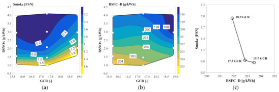 Impact of GCR and EGR on GCI performance in a 15 L heavy-duty diesel engine: (a) smoke; (b) BSFC-D; (c) BSFCV-D/smoke tradeoff.