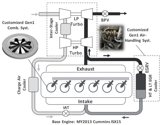 - Kumar, P.; Zhang, Y.; Traver, M.; Watson, J. Tailored Air-Handling System Development for Gasoline Compression Ignition in a Heavy-Duty Diesel Engine. Front. Mech. Eng. 2021, 7, 611916. [Google Scholar] [CrossRef]