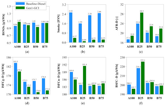 Overview of Gen1 GCI performance results: (a) BSNOx; (b) smoke; (c) AFR-D; (d) ISFCg-D; (e) ISFCn-D; (f) BSFC-D.