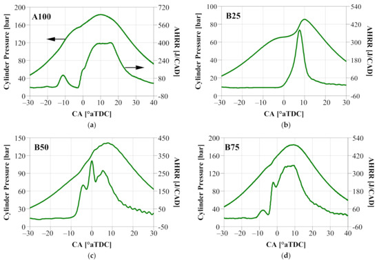 Cylinder pressure and AHRR for Gen1 GCI: (a) A100; (b) B25; (c) B50; (d) B75.