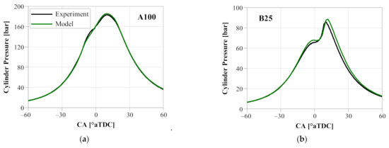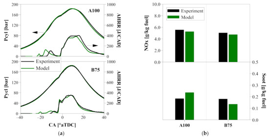 The three-dimensional CFD model validation was conducted at A100 and B75. The thermal boundary conditions at IVC were produced from the abovementioned 1D engine system model. The model constants for the gasoline spray were determined based on the spray characterization data produced in a constant-volume combustion vessel [53]. The soot model rate coefficients were kept consistent at both model validation points.