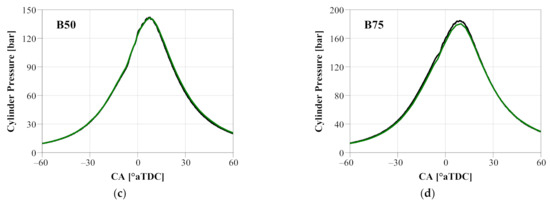 Experimental and simulated cylinder pressure for Gen1 GCI: (a) A100; (b) B25; (c) B50; (d) B75.