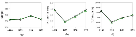 Figure 8 shows that the key Gen1 GCI engine operating boundary conditions, including the EGR fraction, AFR, air flow, fuel flow, and pressure and temperature at both intake and exhaust manifold were well reproduced by the 1D model. Thus, sufficient confidence was acquired to utilize the 1D Gen1 GCI engine model to gain insight into the air-handling performance and identify the areas for further improvement. The high-pressure turbocharger was observed to be responsible for 60–70% of the work from the two-stage boosting system. In Figure 8, the pressure differential across the engine was in the range of 25 to 70 kPa, corroborating the high pumping losses discussed in Section 3.2. Therefore, it is imperative to improve the turbocharging system efficiency. In addition, although the customized exhaust manifold and EGR cooler were able to effectively enhance the EGR gas cooling capacity, they incurred increased flow restrictions and need to be optimized when developing a Gen2 GCI engine.
