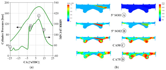 In-cylinder GCI combustion behavior at B75 predicted by 3D CFD: (a) Pcyl and AHRR; (b) cross-sectional equivalence ratio and temperature contours.
