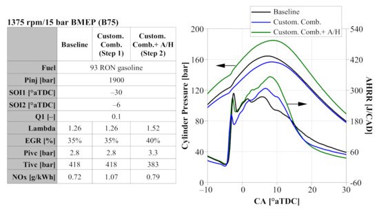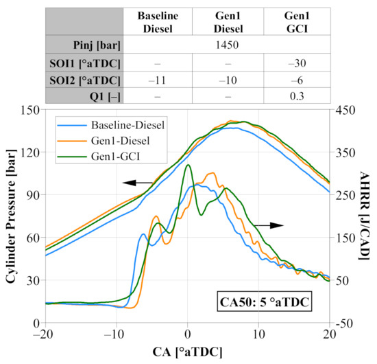 The performance comparison was carried out in two steps while keeping the CA50 constant at 5 °aTDC. First, the impact of the Gen1 combustion and air-handling concept on diesel combustion was evaluated (Baseline-Diesel→Gen1-Diesel). Subsequently, a comparison of diesel vs. gasoline was provided using the customized Gen1 engine system (Gen1-Diesel→Gen1-GCI).