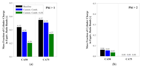 Comparison of in-cylinder air utilization characteristics for GCI at CA50 and CA75: (a) Phi > 1; (b) Phi > 2.