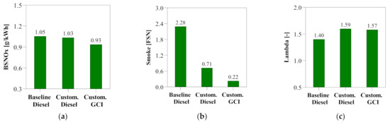 Overview of performance results for Baseline-Diesel, Gen1-Diesel, and Gen1-GCI at B50: (a) BSNOx; (b) smoke; (c) lambda; (d) ISFCg-D; (e) ISFCn-D; (f) CA10–90.