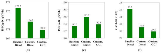 In Figure 14e, it is worth noting that although the ISFCg-D for diesel combustion was enhanced by using the Gen1 concept, the trend was reversed for ISFCn-D. Similar to the observation in Section 3.2, the reversion in trend confirmed that the off-the-shelf air-handling system (turbocharging and EGR loop) incurred high pumping losses. Therefore, there is a clear need to improve the gas exchange efficiency.