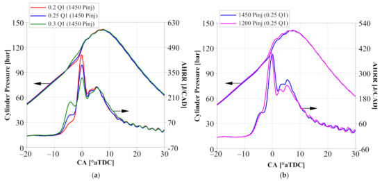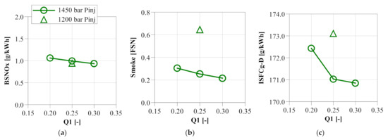 When investigating the fuel injection strategy effects, SOI1 was set at −30 °aTDC based on the aforementioned combustion system design for spray targeting. The SOI2 was varied to maintain CA50 at ~5 °aTDC for the best fuel efficiency. Thus, the fuel injection strategy investigation was focused on Q1 and Pinj. Figure 15 provides an overview of the performance results, capturing the effects of varying Q1 from 0.2 to 0.3 at 1450 Pinj and adjusting Pinj from 1200 to 1400 bar at 0.25 Q1. The global combustion behavior was characterized through cylinder pressure and AHRR, as shown in Figure 16.