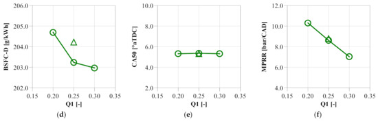 Figure 16a shows that increasing Q1 produced a more pronounced first-stage partially premixed combustion and a reduced peak AHRR, thereby leading to a lower MPRR, fewer in-cylinder heat transfer losses, and better overall in-cylinder air utilization. Therefore, both smoke and fuel efficiency were improved (Figure 15b,c). However, as noted in the smoke and ISFCg-D trends, the improvement started to slow down as Q1 increased from 0.25 to 0.3. This can be attributed to a competing effect between the reduced effective expansion ratio caused by the lengthened combustion duration (Figure 16a) and the abovementioned reduction in heat transfer losses due to the reduced peak AHRR.