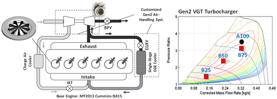 A customized turbocharging system model was constructed and replaced the stock single-stage VGT in the prior model, including two fixed-geometry turbochargers (low-pressure stage and high-pressure stage), an inter-stage cooler (ISC), and associated volume and pipe size assignments. The volume of the ISC was set to at 30% of the main charge air cooler (CAC). The cooling capacity of ISC and CAC was carefully tuned to deliver 60 °C temperature at the ISC outlet and 40–46 °C temperature at the CAC outlet, respectively, across the engine operating points. In addition, a two-stage EGR cooler was incorporated in the EGR loop along with adjustments made to the volume and the piping of the exhaust manifold and the high-pressure EGR loop to accurately represent the flow and the restrictions in the EGR flow path. The pressure differential across the EGR loop and the effectiveness of the EGR cooler were simulated based on benchmark flow data. In addition, the engine exhaust backpressure was set based on the flow characteristics of the aftertreatment system for the base engine.