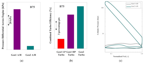 Comparison of gas exchange performance between Gen1 A/H and Gen2 A/H at B75: (a) pressure differential across engine; (b) combined turbocharger efficiency; (c) logP–logV.
