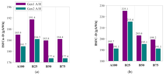 Comparison of fuel efficiency results between Gen1 A/H and Gen2 A/H: (a) ISFCn-D; (b) BSFC-D.