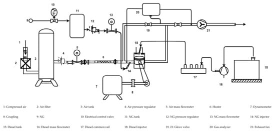 The cylinder pressure was measured using a water-cooled piezoelectric Kistler model 6043/A60 pressure transducer. Intake airflow was facilitated using a compressor that increased the pressure up to 7 bar and stored it in a surge tank. The intake air pressure was adjusted to the desired value using a pressure regulator. The intake temperature was set to any desired value using two immersion-style heaters and a PID controller. All gaseous emissions were measured using a HORIBA model MEXA-584L five-gas emission analyzer.