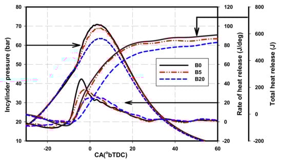 - The maximum in-cylinder pressure was reduced by 3% for B5 and 10.2% for B20 in comparison to B0;