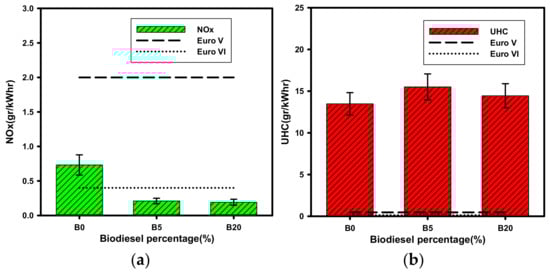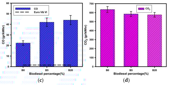 Impact of increasing the biodiesel fraction on engine-out emissions, compared to steady-state stationary diesel engine emission limits of European Euro VI and Euro V: (a) NOx engine-out emissions; (b) UHC engine-out emissions; (c) CO engine-out emissions; (d) CO2 engine-out emissions.