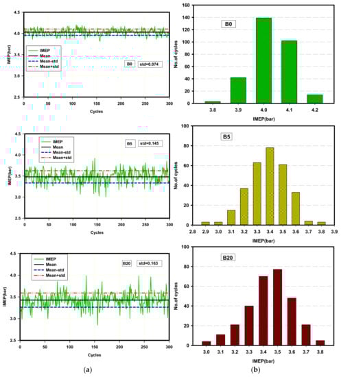 According to Table 5, more than 90% of cycles occur in a narrower IMEP range (3.9–4.1 bar) for B0 and in a wider range for B5 (3.1–3.6 bar) and B20 (3.1–3.7 bar).