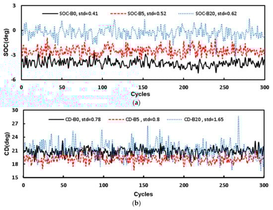 The SOC in RCCI combustion is significantly affected by parameters, such as fuel reactivity stratification, local equivalence ratio, temperature gradient, and residual gas remaining in the cylinder from the former engine cycles, which result in variations in SOC []. The effect of the addition of biodiesel to diesel on the cyclic variations in SOC and CD for 300 successive cycles was investigated, and the SOC and CD time series corresponding to these consecutive cycles are shown in Figure 7.
