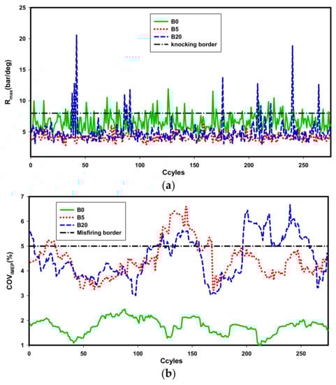 Misfire or partial burn happens for higher amounts of COVIMEP, and knocking appears at a higher value of . In this study, the conditions COVIMEP > 5% and are considered as measurements for the misfire and knocking limits, respectively. Figure 8 shows COVIMEP and Rmax of 275 consecutive combustion cycles corresponding to B0, B5, and B20. According to Figure 8b, in the case of B0, no misfire combustion cycle was observed, and the variation range of COVIMEP is from 1 to 2.5%. According to Table 6, for the case of B5, 51 combustion cycles of 300 cycles show COVIMEP greater than 5% and thus misfire in 18.5% of the total cycles. By increasing the biodiesel share to 20%, it was found that 34.5% of the total cycles belong to misfire combustion cycles, and COVIMEP varies from 3 to 6.7%.