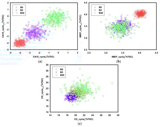 Impact of the increased biodiesel DFI fraction on cyclic historical dependency of combustion parameters: (a) Return maps of CA10 time series data for B0, B5, and B20; (b) Return maps of IMEP time series data for B0, B5, and B20; (c) Return maps of CD time series data for B0, B5, and B20.