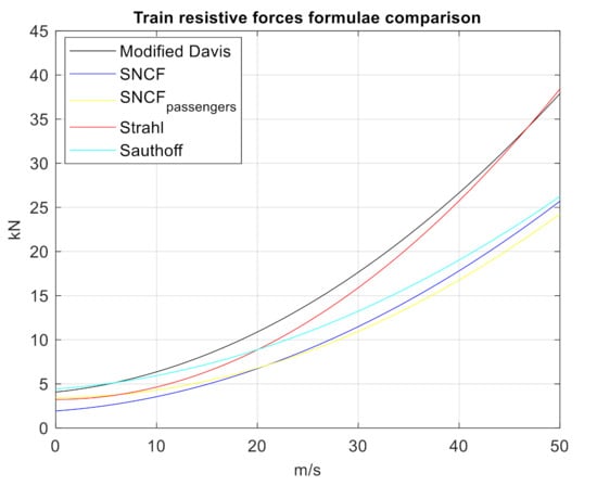 Since we are dealing with a one-directional problem, the vectorial notation will be omitted. Rochard and Schmid [30] recollected the most common formulae used to calculate train resistances and compared them; the formula used in [23] was chosen for its relatively high values compared to the rest, while the plot below (Figure 1) represents the magnitude of the resistive forces that act on the train at various speeds for the convoy studied. The intersection with the y-axis shows the initial effort the locomotive has to overcome at each starting, while at abscissa greater than zero, the force derived from the plot represents the total resistive forces of the train. The formulae analyzed are: the modified David equation, the French National Railway Company “Société Nationale des Chemins de fer Français” SNCF equation for rolling stock, the SNCF equation for train on bogies, the Strahl equation, and the Sauthoff equation.