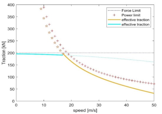 In the figure below, the traction force is represented with respect to velocity. The darker lines represent the ideal forces while the lighter-colored ones represent the forces adjusted by friction (Ftraction − Ffriction), it also being a function of velocity. The plot (Figure 2) is calculated using a 0% gradient: