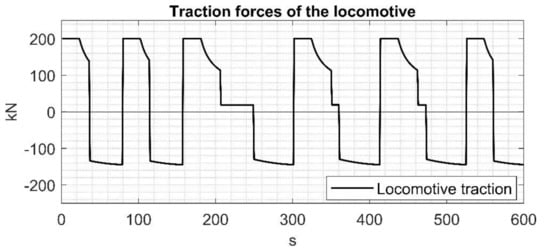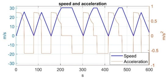 The drive cycle is obtained through an algorithm. The baseline of this algorithm is that the freight accelerates until a point where it either meets the maximum speed or the point at which it needs to start braking. The braking phase is supposed at a constant rate of 0.6 m/s2 [34], which is considered a sharp braking. This is done to preserve the comfort of passengers; this value is also found in [35] as 1.5 mph/s (0.67 m/s2). The acceleration is the maximum acceleration allowed by the traction force Ftraction as found in [23]. The tractive effort is hence determined as such: