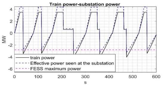 It then starts to calculate the braking distance, i.e., the space needed to come to a halt, and compares it to the space between itself and the next station. When the two spaces coincide, the train starts the braking maneuver. After a period of 1 s the algorithm checks the new Ftraction, calculates the new acceleration, and the process keeps going until the last station is reached. It is important to note that when Ftraction > 0, it represents the pulling force of the motor, while Ftraction < 0 represents the braking force. The maximum power transmissible by the locomotive back to the line is equal to its nominal power. The rest of the power needs to either be dissipated through conventional brakes or be sent to the DC line through other generators. If the regenerative braking is only done by the locomotive, it determines the power limit of our storage, after which the locomotive would not be able to supply more power, which in our case is equal to 2.8 MW.