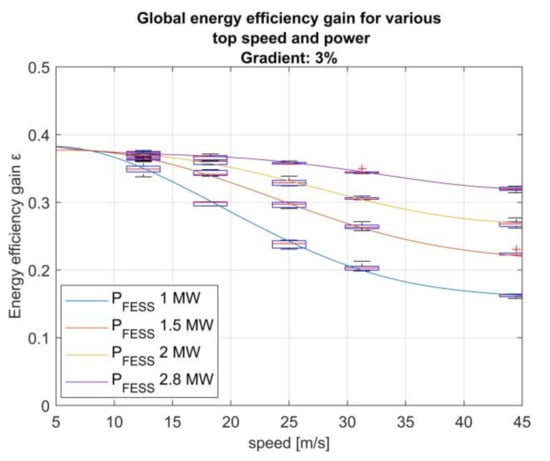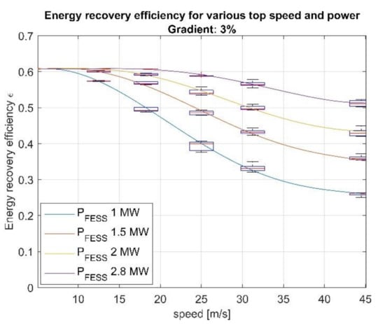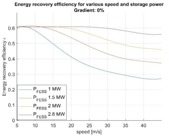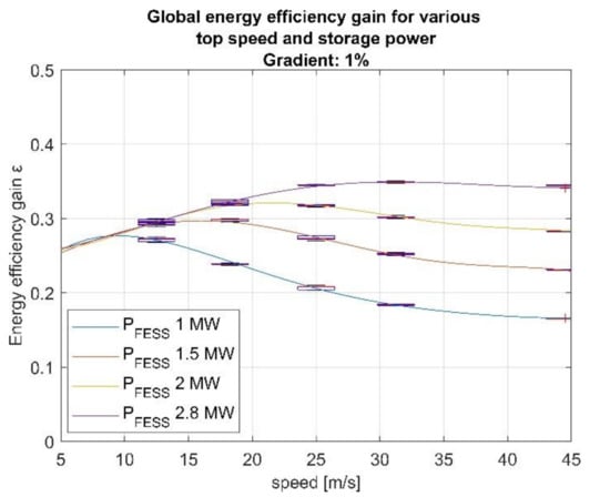 In this table (Table 4), the numerical results for a gradient of 3% are represented; for a top speed of 12.5 m/s, the total energy consumed for the entire journey is 1785 kWh and the energy dissipated under braking that could be instead reaching the substation is 885.7 kWh. Of this, 841.4 kWh could be managed to be recovered by the storage when P = , yielding an energy recovery ratio of 37.7%. When the top speed is set at 44.5 m/s, the energy consumed is equal to 4445 kWh, while the efficiency gain is 31.4%. The energy recovery ratio, i.e., the braking energy that the system manages to recover, is 50.3%; this is dictated by the high top speed and the high bursts of power needed to slow down the convoy. Below, the effects of the storage size and top speed are plotted for the energy recovery efficiency (Figure 10) and the energy efficiency gain (Figure 11):
