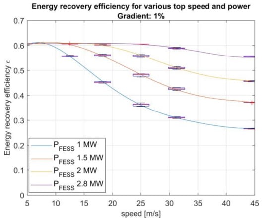Three percent gradient energy recovery efficiency for multiple top speeds and FESS powers.