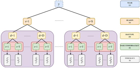 The energy system structure is based on two key elements: the fuels (f), i.e., energy vectors, which represent the commodities and their flows, and the technologies (t) that transform the energy vectors within the modeled system or allow their trading across the system boundaries. Every technology can have one or multiple modes of operation (m) that represent its operational configurations; for every mode of operation, a technology can have different input and output fuels. In addition to technologies, storage (s) systems enable fuel exchanges between subsequent time periods. Regarding the temporal resolution of the model, each year is divided into time slices (l) that are representative portions of the year. Time slices, as represented in Figure 1, are identified by a season, a day type (i.e., day of the season), and a daily time bracket (i.e., part of the day). All the model inputs are fixed in every time slice. The final demand for fuels can be defined on a yearly basis or on a time slice basis, depending on the model purposes and the kind of energy or energy-service demand. Concerning the spatial resolution of the model, all demands and production are related to a specific region (r), and fuel exchanges between regions may occur depending on the fixed constraints.