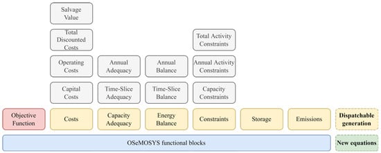 Blocks of functionality of the enhanced OSeMOSYS framework (the illustration is based on []). The new proposed module and equations are highlighted in bold-dashed lines.