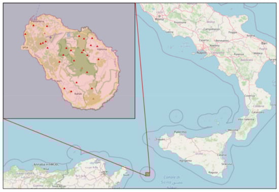 The developed energy model refers to Pantelleria. The island, as a medium-sized, non-interconnected energy system, represents a valuable and representative case study for the local energy self-sufficiency of both remote and interconnected areas. Pantelleira is situated in the middle of the Strait of Sicily, as depicted in Figure 3. Because of its favorable position, it has large availability of solar, wind, and wave energy resources.
