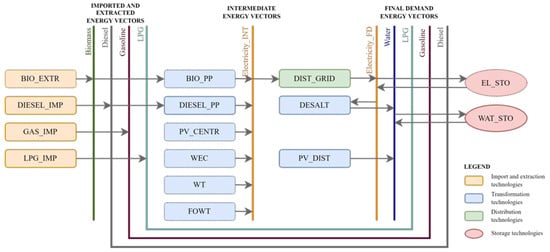The reference energy system of Pantelleria is represented in Figure 4, where currently operating technologies are in solid lines, while those that were considered for the future system evolution are in dotted lines. The representation includes seven energy vectors: LPG (Liquified Petroleum Gases) and gasoline, which are imported from outside the system and consumed for kitchen applications and transportation (LPG_IMP and GAS_IMP), respectively; diesel, which is imported from outside (DIESEL_IMP) and used in diesel power plants or as a final demand for transportation; water, which is produced by electrically powered desalters; electricity, which appears in two different vectors: an intermediate vector and, after the distribution grid, as a final demand and input vector for desalters; and biomass, which is currently not exploited for the production of any of the considered energy vectors and can be internally extracted (BIO_EXTR). The transformation technologies consist of a diesel power plant (DIESEL_PP), a biomass power plant (BIO_PP), centralized (medium to large size) photovoltaic (PV) power plants (PV_CENTR), wave energy converters (WEC), onshore wind turbines (WT), floating offshore wind turbines (FOWT), and desalters (DESALT). The electricity produced by distributed PV plants is assumed to be completely self-consumed by the integration with small-scale storage systems, thus reducing the power demand to the grid. The only represented distribution technology is the power distribution grid (DIST_GRID). The storage systems are water tanks (WAT_STO), which are already used today, and electrochemical storage systems (EL_STO). The boundaries of the modeled system are the physical borders of Pantelleria Island, which is not connected to the Italian power grid but includes the surrounding sea to exploit marine RES. The energy system representation proposed here excludes the burning of biomass in home stoves for heating purposes.
