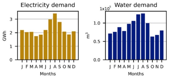 The final overall electricity demand amounts to 27.3 GWh/year; as the water demand has been addressed separately, this value does not consider the energy absorbed by desalination plants (~3.7 GWh/year). As depicted in Figure 5, the demand is characterized by high monthly variability, with a trough of 1.9 GWh/month in April and a peak of 3.4 GWh/month in August. The actual total production of electricity on the island amounts to 39.0 GWh from the diesel power plant and ~0.5 GWh from distributed PV plants on households and public buildings roofs. The electricity demand profile was communicated by the local Distribution System Operator that handles the production, distribution, and sale of electricity on Pantelleria and refers to the year 2018. Overall, the monthly water and electricity demand profiles appear somehow related to each other, and they both strongly depend on the tourist numbers on the island.